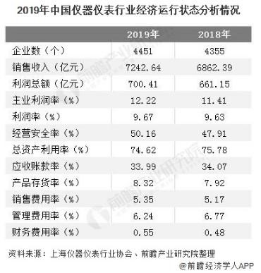 2019年儀器儀表行業除了總資產利用率、產品存貨率、銷售費用率和財務費用率四個較2018年同期有所下降外,其余指標均實現了增長。其中2019年儀器儀表行業實現銷售收入7242.64億元,同比增長5.54%;實現利潤總額700.41億元,同比增長5.94%。總體來看,儀器儀表行業運行情況較為穩定。