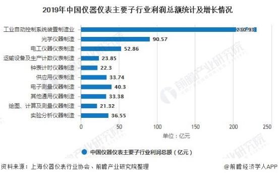 從利潤總額來看,工業自動控制系統裝置制造行業利潤總額同樣在儀器儀表子行業中排名第一,2019年實現利潤總額230.93億元,同比下降3.72%。從增幅來看,光學儀器制造行業利潤增幅最大,較2018年同比增長58.94%。